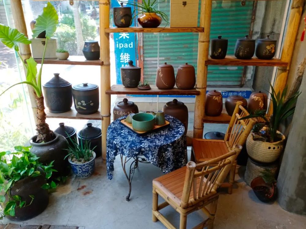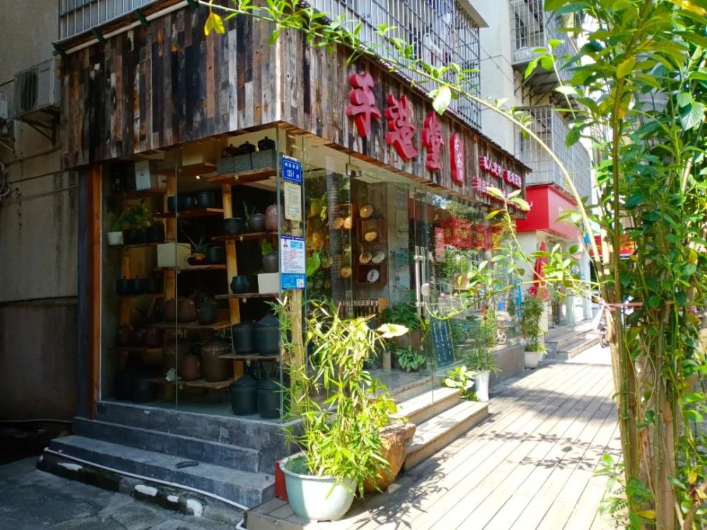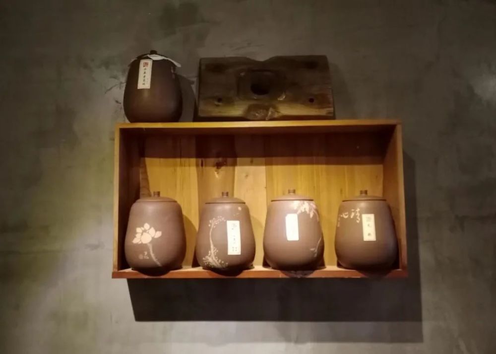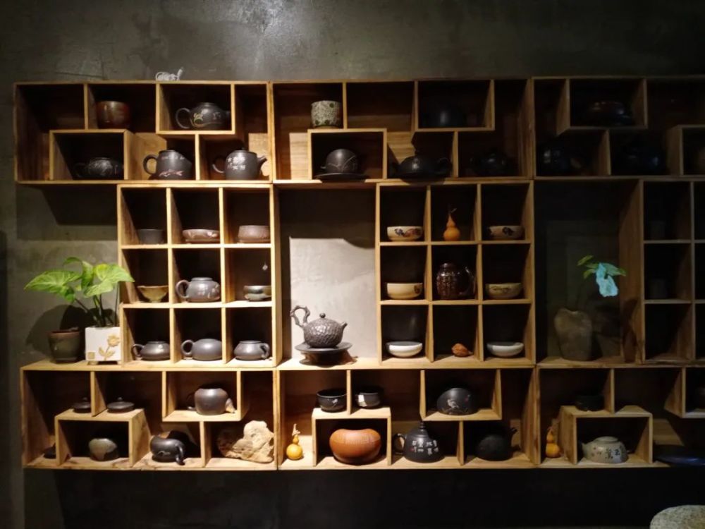 走过松柏路一长排绿植欣荣的花店,一处花木扶疏的玻璃落地墙内就隐藏着一间古茶坊,一整排整柜的砂罐掩映在草木之后,古韵盎然。室内淡淡的暖黄色灯光温柔氤氲开,仿佛在悄悄倾诉着什么故事,吸引着你走近它。