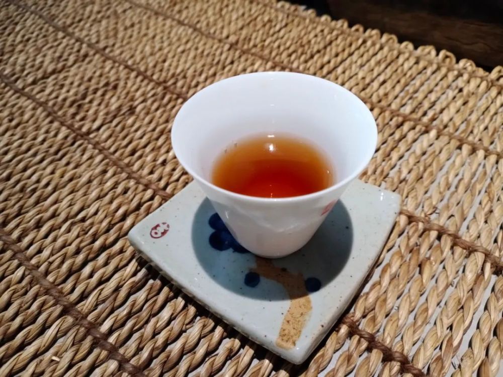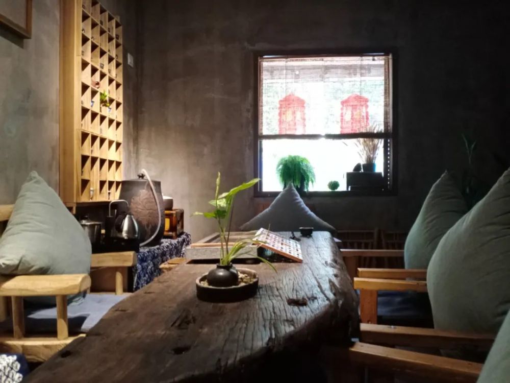 茶坊内仅有的两间茶室也秉持了一致的风格,靠内的一间极其安静,光线柔和,墙上的书法行云流水笔走龙蛇,对着门的墙上嵌置了大大小小的木格子,底蕴厚重的砂壶、盏静静陈列,等待着它们的有缘人。临街的茶室窗户较大,通透明亮,透过纱质卷帘,依稀可见红色的剪纸灯笼轻轻摇曳,再往外绿化树前偶尔有车辆的身影掠过。布满岁月痕迹的木质茶桌,散发旧时光韵味的蓝印花布,以及纹理有致的草编茶席,都让人觉得心安、舒适。再抿一口糯香悠扬、口感醇厚的普洱茶,真是岁月静好!