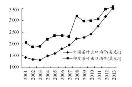 2001-2013年中印两国茶叶出口均价对比